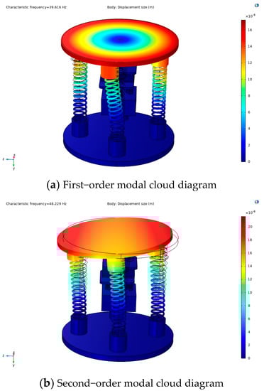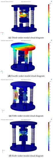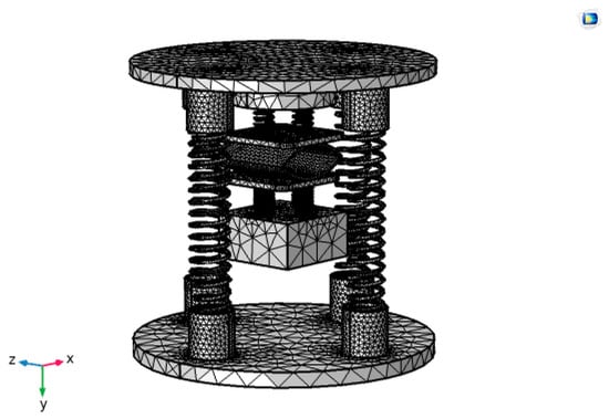 Since this experimental study is on energy harvesting under non-resonance, the frequency characteristics under resonance need to be simulated through simulation to provide theoretical support for subsequent non-resonance experiments. According to the kinetic model, the capturer mainly consists of a spring and a mass block. When the capturer is externally excited, the piezoelectric module is forced to vibrate with the spring. The spring-mass-damping system enables us to obtain the differential equation of the vibration of the captive energy device and, thus, the input–output response of the captive energy device under external excitation. Therefore, to know the actual operating state of the captive energy, it is necessary to perform a modal analysis of its captive energy. Its modal analysis is also the starting point for the study of forced vibration devices by transient analysis and harmonic response analysis. Therefore, the COMSOL Multiphysics simulation software was used to fix constraints on the lower spring substrate in the physical field, and all springs were set as spring bases in the physical field, and the overall free tetrahedral mesh was used for the partitioning, as shown in Figure 6. Since the frequency generated by the capturer itself is not too high during operation, only the modal analysis of the first six orders is considered, and the simulation results are shown in Figure 7.