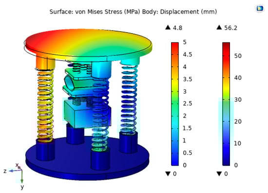 The structural strength of the capsule is analyzed using COMSOL Multiphysics simulation software in order to ensure the proper operation of the capsule due to the continuous external excitation during operation. First, the bottom surface of the lower spring substrate of the energy trap was fixedly restrained. Next, a body load of 30 N was applied to the upper spring substrate by choosing a body load in the physical field, which was divided using a free tetrahedral mesh. Finally, the study was solved for the steady state. The simulation results are shown in Figure 8.