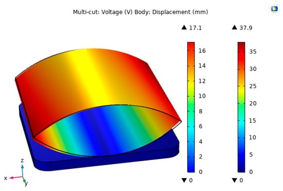 As can be seen from Figure 9, the maximum output voltage generated by the piezoelectric module was 17.1 V and the output displacement generated under a 30 N boundary load was 37.9 mm. The output voltage obtained from the simulation was more ideal and can meet the experimental requirements.