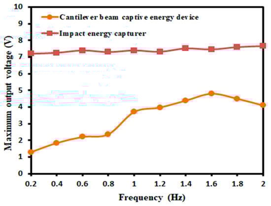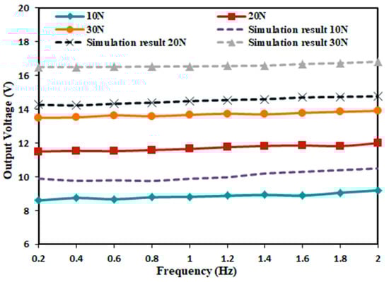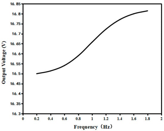 As can be seen from Figure 10, in the frequency range of 0.2–2 Hz, the faster the frequency of the excitation force, the higher the output voltage, but the difference was not too obvious. The maximum value of the output voltage was only 0.319 V different from the minimum value. The above situation may occur because of the increase in excitation frequency, while the impact force remains the same, causing a slight difference in the state of the piezoelectric unit when deformation and recovery are performed. However, as the frequency increased, the deformation of the reciprocating piezoelectric module increased, resulting in a slight increase in the output voltage generated by the capturer, so the increase is not very significant.