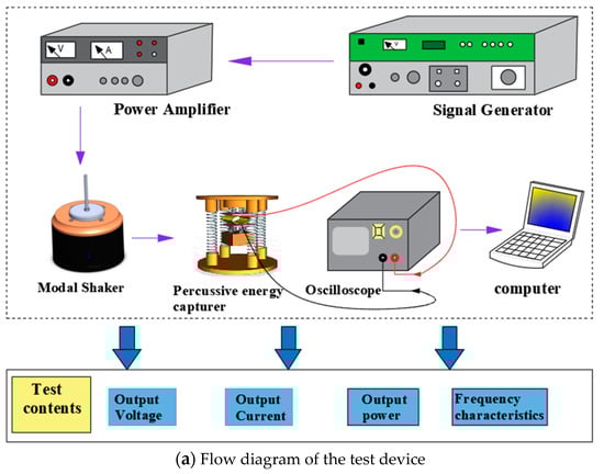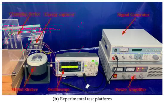In order to verify the feasibility of the theoretical energy capturer model, the experimental prototype was machined using a precision engraving machine and the experimental platform was built. The flow diagram of the test setup is shown in Figure 11a, and the experimental test platform of the impact piezoelectric energy capturer is shown in Figure 11b. It mainly includes a capturer prototype, clamping device, modal exciter (SA-JZ005T), signal generator (SA-SG030), power amplifier (SA-PA010), oscilloscope (RIGOL-DS1102), and computer. Experimental method: After the experimental prototype is assembled and fixed with the clamping device, start the power supply of the oscilloscope, power amplifier, and signal generator, connect the piezoelectric film with the oscilloscope, adjust the signal generator and power amplifier to make the exciter apply the excitation force at the bottom of the lower spring base, record the peak data generated by the energy capturer in the oscilloscope, and transfer the data sampling to the computer for processing. The characteristic relationship curves of output voltage, output current, and output power generated by different bending amplitude and film size in low-frequency environments are tested by oscilloscope.