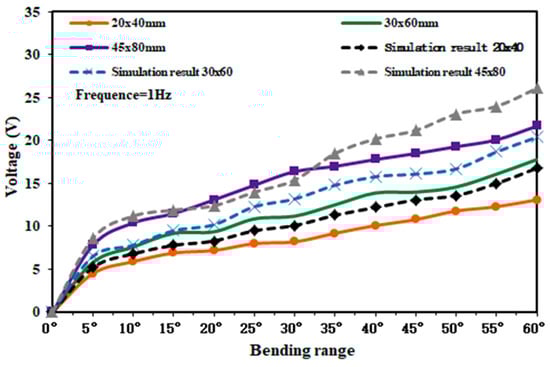 Since the bending amplitude and size of the piezoelectric film in the capturer have a great influence on the output voltage. Therefore, the selected piezoelectric film sizes are 20 × 40 mm, 30 × 60 mm, and 45 × 80 mm. By changing the bending amplitude of the piezoelectric film, the magnitude of the output voltage under different film angles was measured by using an oscilloscope when the external excitation force was 30 N. The experimental test and simulation results are shown in Figure 12.