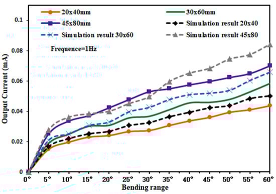 The piezoelectric film sizes of 20 × 40 mm, 30 × 60 mm, and 45 × 80 mm were selected and measured by using the above experimental method, changing the bending amplitude of the piezoelectric film and the horizontal surface, and measuring the output current of different size capturers by using the probe of the oscilloscope. The experimental test and simulation results are shown in Figure 13.