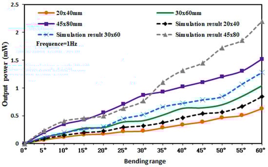 As can be seen from Figure 14, when the bending amplitude of the piezoelectric film in the capturer was 60°, the output power of the 20 × 40 mm piezoelectric film capturer was 0.6276 mW, the output power of the 30 × 60 mm piezoelectric film capturer was 1.0395 mW, and the output power of the 45 × 80 mm piezoelectric film capturer was 1.5176 mW. The maximum output powers of the piezoelectric films obtained from the simulation were 0.844 mW, 1.277 mW, and 2.197 mW, respectively. The obtained simulation results were higher than the experimental results in the test, on the one hand, may be due to the fact that the output voltage and output current obtained from the simulation were under the ideal environment, ignoring the internal variation of the piezoelectric layer and the adhesion layer, making the layered structure non-conducting, thus producing this phenomenon. On the other hand, the piezoelectric film was deformed by the external force, which leads to losses in the process of charge generation with the connected circuit, and, thus, the experimental results are lower than the simulation results.