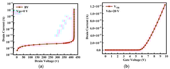 The schematic cross-sectional view of the simulated power MOSFET device is shown in Figure 1. Table 1 gives the corresponding device structure parameters in detail. As shown in Figure 2, the breakdown voltage (BV) and threshold voltage (VTH) of the device are 424 V and 5.5 V, respectively, which are in good agreement with [7,14]. The single event burnout (SEB) threshold voltage of the device in [14] is 330 V (50% BV) under a LET value of 17 MeV∙cm2/mg, and the simulated device in this paper has a SEB threshold voltage of 307 V (72% BV) under the same LET value, exhibiting an increase of about 20% since the adoption of the SEB hardening techniques of the Pplus extension and the insertion of the buffer layer in our device structure [15,16,17].