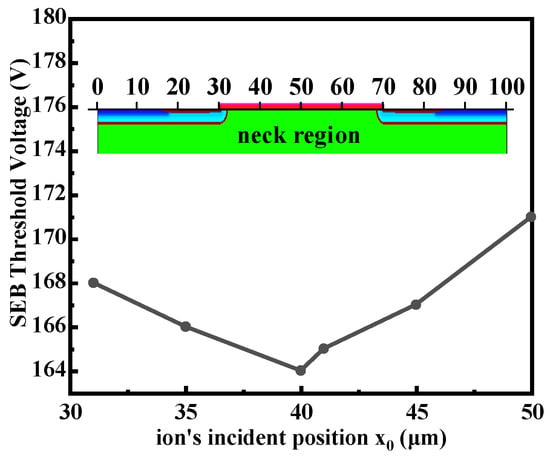 Previous investigations have shown that the neck region of power MOSFETs is the sensitive area to SEB [8,12,18,19]. This is because the neck region, which is far from P-body, is more resistive when the lateral hole current flows to the source electrode, developing a larger ohmic voltage drop across the emitter-base junction, making the parasitic BJT easier to be forward biased. Thus, the corresponding neck region from x0 = 31 μm to x0 = 50 μm of the simulated power MOSFET is chosen to obtain the most sensitive ion strike position in our simulations. Figure 3 exhibits the relationship between the ion’s incident position x0 and SEB threshold voltage (Vth,SEB) at LET = 75 MeV∙cm2/mg, where Vth,SEB is defined as the minimum drain voltage required to trigger SEB. It can be concluded that x0 = 40 μm is the most sensitive incident position with the lowest Vth,SEB of 164 V. Therefore, x0 = 40 μm is selected as the default incident position in our following simulations so as to obtain the worst case for SEB. In addition, it should also be pointed out that we regard the SEB failure criterion as the maximum lattice temperature of the device after the ion strike reaches the melting point of silicon (1688 K) [9,20].