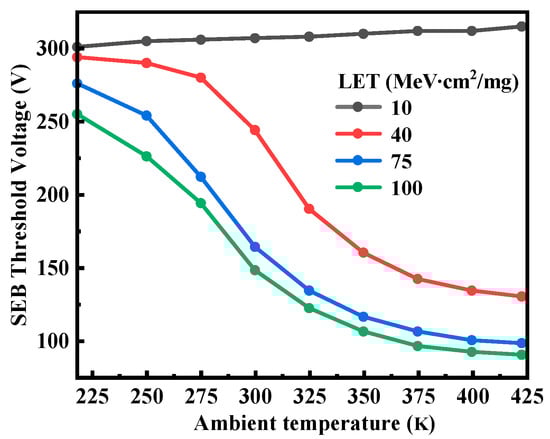 Figure 4 shows Vth, SEB as a function of ambient temperature (Ta) at different LETs. Our selected ambient temperature varies from 218 K to 423 K (−55 °C to 150 °C), which corresponds to the operating temperature range of military components. It is obvious that the SEB response exhibits different temperature dependencies at different LET values. At the lower LET value of 10 MeV∙cm2/mg, Vth,SEB increases slightly with the increase of ambient temperature. On the contrary, with the LET value greater than 40 MeV∙cm2/mg, Vth,SEB decreases as temperature increases. To get a better understanding of the discrepancy of the temperature dependence of SEB at different LETs, the following discussions are mainly focused on the two conditions: condition A is at the lower LET (10 MeV∙cm2/mg) and Vds = 300 V; condition B is at the higher LET (100 MeV∙cm2/mg) and Vds = 100 V.