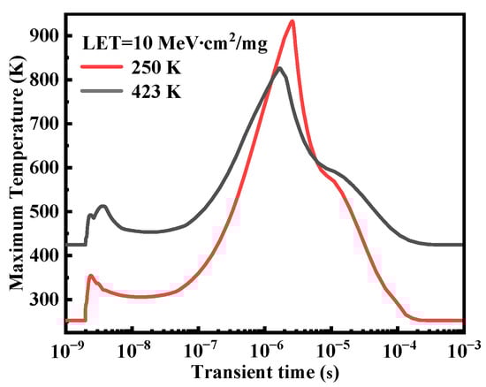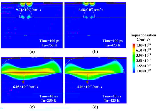 In order to analyze the influence of ambient temperature on SEB sensitivity at the low LET, Figure 5 demonstrates the impact ionization rate distributions at Ta = 250 K and Ta = 423 K under condition A (LET = 10 MeV∙cm2/mg, Vds = 300 V). From Figure 5, we can find that the peak impact ionization rate is located at the P-body/N-epi junction after the ion strike 100 ps, while it shifts to the N-epi/N-buffer interface after the ion strike 10 ns. This is due to the Kirk effect caused by the injection of electrons from the emitter to the collector and the resulting less positive total charge density in the collector region [18,21]. At Ta = 250 K, the peak impact ionization rates are 9.71 × 1025/cm3·s and 6.08 × 1025/cm3·s after the ion strike 100 ps and 10 ns, respectively. However, when Ta = 423 K, the peak impact ionization rates are 6.68 × 1025/cm3·s and 4.06 × 1025/cm3·s, respectively, which decreases about 40% with the increase of Ta from 250 K to 423 K. This is because the increase of temperature will aggravate the vibration of the lattice, which will lower the mean free path of the carriers and decrease the impact ionization rate in the device. Therefore, the transient current induced by the carrier multiplication process will be smaller at a higher ambient temperature. Consequently, the maximum lattice temperature after the ion strike at Ta = 423 K (826 K) decreases compared with the case at Ta = 250 K (928 K) as shown in Figure 6. Our simulations show that the SEB tolerance of power MOSFETs has a positive correlation with the ambient temperature at the lower LET, which is in good agreement with the literature report [10,11,12].