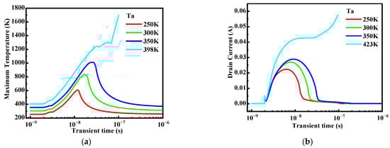 Then, the condition at the higher LET (condition B) is discussed. Figure 7 shows the lattice temperature and drain current variations of the device versus time at different Ta under condition B (LET = 100 MeV∙cm2/mg and Vds = 100 V). It can be seen that the ambient temperature has an important influence on the SEB performance of power MOSFETs. With Ta increasing, the maximum lattice temperature after the ion strike varies from 604 K (Ta = 250 K) to 1010 K (Ta = 350 K). These values do not exceed the melting point of silicon and the lattice temperature can eventually recover to the ambient temperature, indicating no burnout. However, at Ta = 398 K, the maximum lattice temperature rises rapidly and can even exceed 1688 K, leading to catastrophic failure, and the drain current can maintain a high level. Once the SEB failure criterion is triggered, the simulation is terminated, and thus the simulation stops at about 100 ns at Ta = 398 K. From the transient temperature response, it can be observed that the device is more sensitive to SEB at a higher temperature under condition B, completely different from which we observed under condition A.