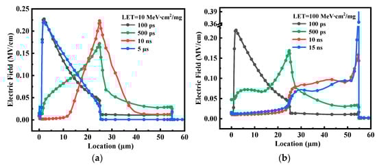 The electric field distributions of power MOSFET after an ion’s strike at (a) LET = 10 MeV∙cm2/mg and (b) LET = 100 MeV∙cm2/mg (Ta = 250 K, Vds = 300 V).