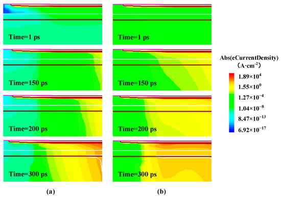 Figure 9 shows the electron current density distributions near the parasitic BJT at (a) Ta = 250 K and (b) Ta = 423 K under condition B. It can be seen that the electron current density near the collector region increases greatly as time increases. This is because the heavy ion-induced hole current moves laterally through the P-body to be collected by the source electrode, resulting in a forward voltage drop across the emitter junction to turn on the parasitic BJT and amplify the current. Compared with the case at Ta = 250 K, the electron current density at Ta = 423 K is larger, especially after 150 ps. We assume that the parasitic BJT is turned on when the ratio of the source electron current to source total current reaches 0.97 in our simulations, while it indicates that the emitter junction is turned on and the electron current has become the dominating part of the source total current. For Ta = 423 K, it only takes 99.2 ps to turn on the parasitic BJT while it takes 225.8 ps for Ta = 250 K. Thus, it can be concluded that the parasitic BJT at Ta = 423 K is turned on at about 100 ps earlier than that at Ta = 250 K. This is because the ambient temperature has a significant influence on the built-in voltage of the emitter-base junction and the base resistance (RB). With the increasing temperature, the intrinsic carrier concentration will increase exponentially, reducing the built-in potential of the emitter-base junction, meanwhile, RB increases caused by the decreased mobility, both making the parasitic BJT easier and earlier to be turned on [22,23].