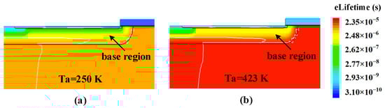 where τ0 is the carrier lifetime when the lattice temperature is 300 K, T is the lattice temperature and α is 2.1 [26]. Figure 10 shows a comparison of the minority carrier electron lifetime distribution in the base region of the BJT at Ta = 250 K and Ta = 423 K, from which we can observe the longer minority carrier electron lifetime at Ta = 423 K and it is consistent with the relationship between carrier lifetime and temperature as shown in (2). Thus, with the higher ambient temperature, more electrons injected from the emitter can be collected by the reverse-biased collector junction, resulting in a larger current gain.