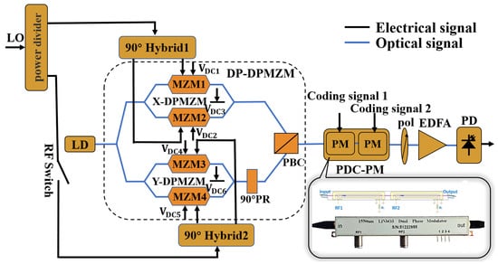To date, many schemes based on photonics have been proposed to realize phase-coded signals, for example, schemes based on spectral shaping and frequency-time mapping [5,6,7,8]. These methods can generate arbitrary waveforms through computer programming and are flexible and reconfigurable, but the system is complex and easily causes large power losses. The other scheme is based on an optical heterodyne, which has been widely studied because of its simple structure, high compactness, and stability. The difference in the phase modulation efficiency of dual polarization light signals in cascaded polarization modulators (PolM) or phase modulators (PM) is used to realize phase coding. Phase-coded signals with fundamental/doubling frequency and different phases can be generated by two cascaded PolMs [9], a dual-parallel PolM (DP-PolM) cascaded with PolM [10] and a dual-polarization dual-parallel Mach–Zehnder modulator (DP-DPMZM) cascaded with a PM [11] or PolM [12]. Fiber Bragg gratings (FBGs) were used to separate the two modulated optical sidebands [13,14] and then a PM was used to load the phase-coded signal in one of the sidebands, or the optical carrier was directly divided into two parts, one of which loads the local oscillator (LO) signal through an optical frequency shifter and the other carries out phase modulation with a PM [15]. Finally, those two signals are combined to beat and obtain the phase-coded signal. In addition, the phase-coded signal may also be generated based on a single parallel structure integrated modulator with multiple radio frequency (RF) ports, in which the upper and lower branches are loaded with microwave carrier frequency and a coding signal, respectively. A dual-drive Mach–Zehnder modulator (DD-MZM) [16], dual-parallel dual-drive Mach–Zehnder modulator (DP-DDMZM) [17], dual-polarization DD-MZM (DP-DDMZM) [18], or DP-DPMZM [19,20] was used to generate phase-coded signals.