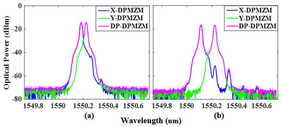 Measured output optical spectra of the X-DPMZM, Y-DPMZM, and DP-DPMZM with a frequency of (a) 5 GHz and (b) 14 GHz.