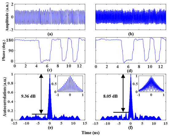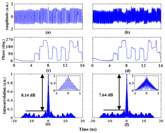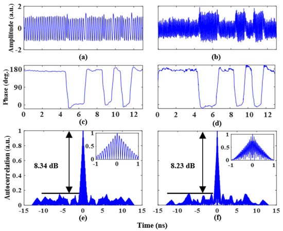 Next, two coding signals ( and ) generated by the AWG are amplified by an electrical amplifier and loaded into the two RF ports of the PDC-PM. Two 1 Gb/s coding signals with a length of 13 bits and a pattern of “1, 1, 1, 1, 1, 0, 0, 1, 1, 0, 1, 0, 1” are applied to the PDC-PM. To realize the binary phase-coded signal, the amplitude of the two coding signals is . Figure 4a,b shows the phase-coded time-domain waveforms of 5 GHz and 14 GHz microwave signals. The extracted phase information can be obtained with the Hilbert transform, and the results are shown in Figure 4c,d. The phase jump of can be clearly observed from the experimental results, and its phase information fits well with the trend of the loaded coding signal, which is consistent with the theoretical analysis. To evaluate the pulse compression capability of the proposed system, the autocorrelations of the phase-coded signals are calculated. Figure 4e shows the phase-coded signal autocorrelation results at a frequency of 5 GHz, and the illustration shows an enlarged view. The peak-to-sidelobe ratio (PSR) and full width at half maximum (FWHM) are 8.34 dB and 0.83 ns, respectively. The pulse compression ratio (PCR) is calculated to be 15.6. The autocorrelation results at a frequency of 14 GHz are shown in Figure 4f. The PSR and FWHM are 8.23 dB and 0.72 ns, respectively. The PCR is calculated to be 18.