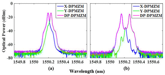 where , , and correspond to the phase shifts of the sub-MZM in the Y-DPMZM induced by DC bias. Therefore, the optical field of the DP-DPMZM can be expressed as