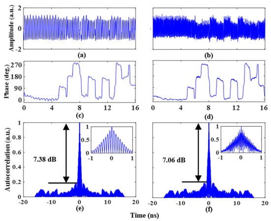 Quaternary phase-coded signal waveform with a frequency of (a) 5 GHz and (b) 14 GHz, (c,d) for the recovered phase information. Autocorrelations of the quaternary phase-coded signal at a frequency of (e) 5 GHz and (f) 14 GHz. The insets show the zoomed-in views of the corresponding autocorrelations.