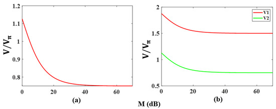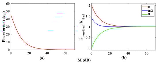 Figure 10a shows the relationship between the change in voltage for phase shifting in the binary phase-coded signal and the carrier rejection ratio M. As seen from Table 1, in an ideal situation, a binary phase-coded signal can be obtained when the amplitudes of both coding signals are . Since the carrier cannot be completely suppressed, it is necessary to increase the voltage difference to offset the phase of in the additional term of Equation (19), to produce an accurate phase shift. In the simulation, the amplitude of coding signal is fixed, and only the amplitude of coding signal is changed to obtain the desired phase offset. The results show that the larger the carrier residue is, the higher the required amplitude of the coding signal.