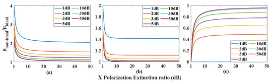 The variation in the microwave signal amplitude ratio between the nonideal state and ideal state with the polarization extinction ratio at different polarization extinction ratio settings. (a) in , (b) in and (c) in .