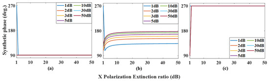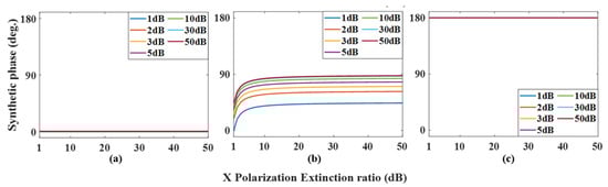 In an ideal case, regarding the phase and amplitude of the output optical signal, it can be clearly seen that increases linearly with the increase of modulation voltage in PDC-PM, and the amplitude remains unchanged. When there is polarization crosstalk in the experiment, changing the phase modulation voltage of PDC-PM can make the phase shift change correspondingly. As , , and are often used in the experiment, the changes in the amplitude and phase of the synthesized signal with the polarization extinction ratio under three values are simulated, and the results are shown in Figure 11 and Figure 12, respectively. Figure 11a shows the variation in the amplitude ratio between nonideal and ideal cases with the extinction ratio of X polarization when . Different curves show different values of the extinction ratio of Y polarization, and it can be seen that with the increase in and , the ratio gradually approaches 1. When the results of and are shown in Figure 11b,c, it can be seen that when the values of and are close to those of ordinary commercial modulators, that is, , the amplitude fluctuation is within the range of 6.5%. Figure 12 shows the changes in the output signal phase under different conditions. When and , the synthesized phase meets the ideal situation, that is, , while , when , the error of the synthesized phase is less than 3.8°.