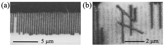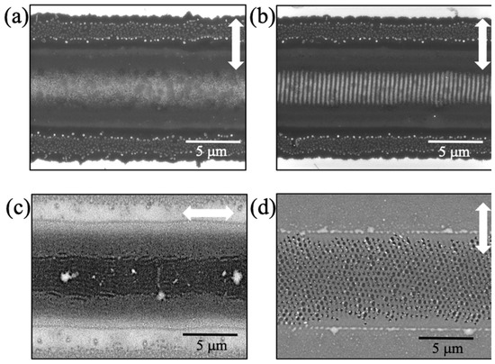 Interestingly, for films that were produced at the higher range of intensities and which have been “developed” in organic solvents, the thickness variation was exaggerated to an extent that the grating became a periodic arrangement of isolated ribbons with approximately 200 nm width, as shown in the SEM images of Figure 2. These ribbons were separated by gaps of exposed substrate, which appeared to contain irregular structures of even smaller dimensions (Figure 2a,b) that may be connected to the ribbons. Those smaller structures were about ~50 nm wide and they appeared to be randomly distributed, and therefore they do not qualify as high spatial frequency LIPSS [20,21]. In some cases of excessive “development”, the ribbons may detach from the tracks, as shown in (Figure 2b).