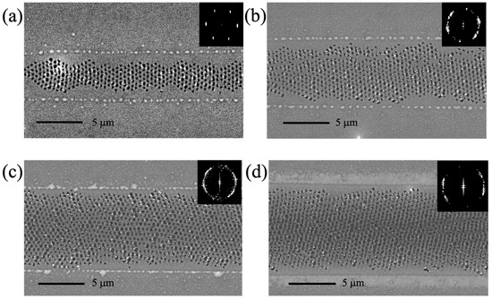 SEM images of 2D LIPSS structures, which have been produced using the different irradiating laser intensities (a) 0.51 MW/cm2, (b) 0.64 MW/cm2, (c) 0.76 MW/cm2, and (d) 0.89 MW/cm2. The insets correspond to a Fourier transform of the 2D LIPSS pattern.
