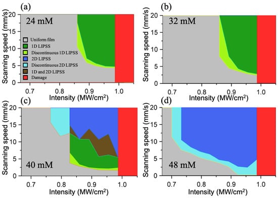 Parameter maps (laser intensity, scanning speed) indicating the regions where various LIPSS formations were observed for (a) 24 mM, (b) 32 mM, (c) 40 mM, and (d) 48 mM precursor film concentrations. The color key for the various observations is shown as an inset in (a).