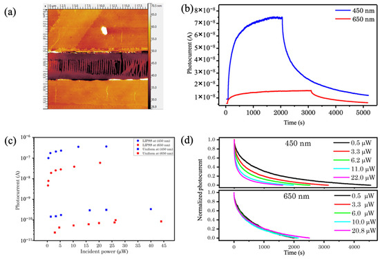 (a) AFM image of the nanostructured device. The central section consists of an array of isolated nanoribbons enveloped by a pair of metal (Au) electrodes (top and bottom); (b) temporal evolution of photocurrent (growth and decay when excitation laser is switched on and off, respectively) for 650 and 450 nm excitation, at the same power (5.3 µW); (c) saturation values of the photocurrent as a function of incident power for 650 and 450 nm excitation, for nanostructured (LIPSS) and continuous devices; (d) decay curves of the photocurrent corresponding to 450 nm (top graph) and 650 nm (bottom graph) excitation, for various excitation powers.