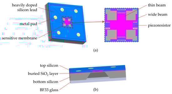 In order to achieve pressure measurement at high temperatures, SOI was chosen as the substrate material. The pressure sensor chip consists of the top silicon, the buried SiO2 layer, the bottom silicon and the BF33 glass with a thermal expansion coefficient similar to silicon, as shown in Figure 1b. The top silicon is mainly used to fabricate piezoresistors, the buried SiO2 layer is used to achieve electrical insulation at high temperatures, the bottom silicon is mainly used to fabricate the cavity and the BF33 glass is used to form a sealed vacuum cavity with the SOI wafer. The metal pads, heavily doped silicon leads and the pressure sensitive membrane are shown in Figure 1a. The sensitive membrane is composed of the buried oxygen layer, and the structure in the bottom silicon. For ease of processing, heavily doped silicon leads were chosen for the connection of the piezoresistors to build the Wheatstone bridge [22].
