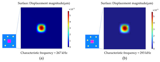 On the whole, compared with flat and composite structural membranes, the beam membrane is easier to fabricate, has a higher characteristic frequency and has a better stress concentration effect. Therefore, the crossbeam structure with widened roots was designed by optimizing on the basis of previous studies [23,24]. The crossbeam is located on the front side of the pressure sensitive membrane, and the symmetry axis of the crossbeam is consistent with that of the sensor chip. When subjected to a forward pressure load, the stress concentration occurs in the root of the crossbeam, which can improve the sensitivity of the sensor. The crossbeam also strengthens the pressure sensitive membrane, increasing its stiffness and characteristic frequency. The characteristic frequency of the square membrane and the root-widened crossbeam membrane were analyzed by the COMSOL Multiphysics software, as shown in Figure 2. The main conditions of the simulation included: (1) The membrane thickness and the membrane length of the two kinds of membranes were the same. (2) The fixed constraint was applied on the back of the sensor chip. The main assumptions of the simulation included: (1) Compared to the sensitive membrane, structures such as piezoresistors and leads have little effect on the characteristic frequency and were therefore not considered. (2) The thickness of the buried oxygen layer is negligible compared to the thickness of the sensitive membrane. It can be seen from Figure 2 that the characteristic frequency of the root-widened crossbeam membrane is 26 kHz higher than that of the square membrane, which enables the proposed sensor to measure rapidly changing signals.