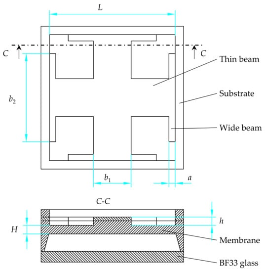 In order to optimize the structural dimensions, the corresponding variables need to be defined for each structural dimension. L is the membrane length, H is the membrane thickness, b1 is the thin beam width, b2 is the wide beam length, a is the wide beam width and h is the beam thickness, as shown in Figure 3. The schematic of the sensor structure in Figure 3 looks different from the actual structure because drawing the schematic based on the actual dimensions results in the structure of the pressure sensitive membrane looking very small and thus not being able to mark the corresponding dimensions. The actual sensor structure was therefore simplified, and some dimensions were adjusted in order to clearly show the dimensions of the sensor structure.