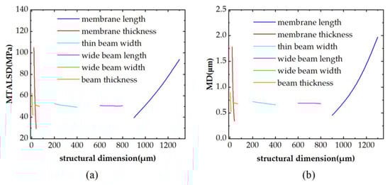 The sensitivity and nonlinearity are two important indicators of pressure sensors, which are largely dependent on the structural dimension. The MTALSD on the membrane centerline is related to the sensitivity of the sensor, and the MD of the membrane center is related to the nonlinearity of the sensor [25]. Therefore, MTALSD and MD are important considerations when optimizing the structural dimension. In this paper, the optimum structural dimension was determined by solving the optimal model. In order to achieve the highest sensitivity, MTALSD was used as the objective function of the optimal model. Low nonlinearity is achieved when the MD is less than one-fifth of the membrane thickness [26]; hence, MD was used as the constraint function. The objective and constraint functions regarding the structural dimension then need to be determined separately by means of curve fitting. Before curve fitting, it is necessary to analyze whether each structural dimension variable has an effect on the MTALSD and MD. If a structural dimension has an effect on the MTALSD or MD, then it should only be considered when curve fitting for MTALSD or MD. Otherwise, the process of curve fitting cannot be completed, or the function determined by curve fitting is highly inaccurate.