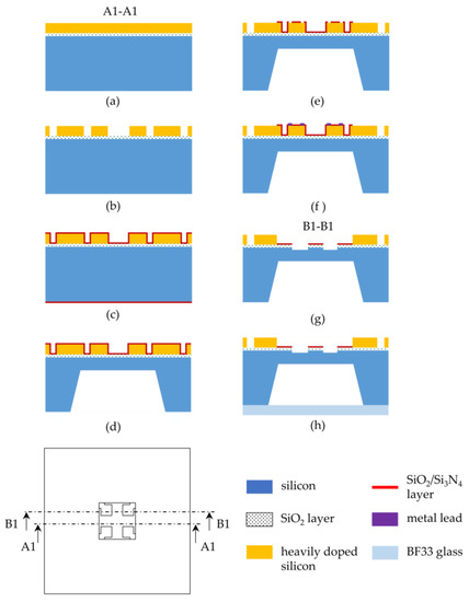 A 4-inch P-type SOI wafer in the (100) direction was used and then fabricated by bulk-micromachining technology. An overview of the fabrication process of the sensor is shown in Figure 5.