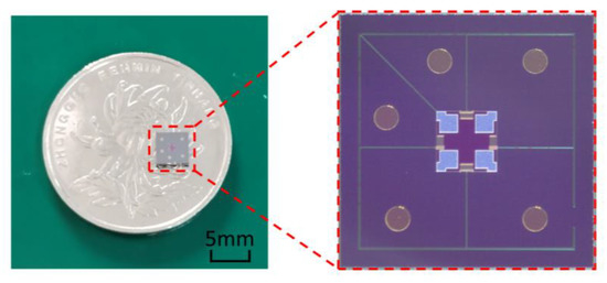 The fabricated pressure sensor chip is shown in Figure 6, which indicates that the chip was relatively small. The crossbeam with widened roots was consistent with the design, and the metal pads were also intact. Thus, it can be demonstrated that the entire fabrication process of the chip is reasonable.