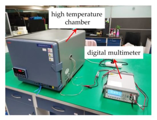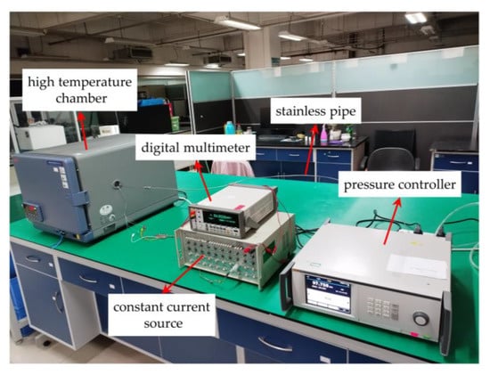 The standard pressure load was provided by a pressure controller (6270A, Fluke, Everett, WA, USA) with a measurement range from 3.45 to 357 kPa. The lower limit of the standard pressure value that this pressure controller can easily provide is 4 kPa when the sensor is tested. Therefore, to facilitate the testing of the sensor, the minimum standard pressure value was taken to be 4 kPa. The multi-channel constant current source supplied the sensor with a constant current of 1 mA, and the voltage output signal of the sensor was read by a digital multimeter (8846A, Fluke, Everett, WA, USA). The high-temperature chamber (STH120, ESPEC, Osaka, Japan) provided a constant temperature environment. The pressure controller was connected to the sensor in the high-temperature chamber through a thin stainless pipe to test the performance of the sensor at different temperatures.