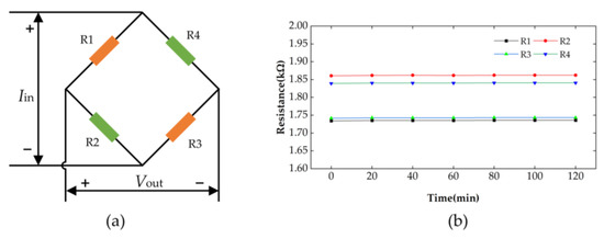 (a) The Wheatstone bridge. (b) Curve of the resistance variation within 2 h.