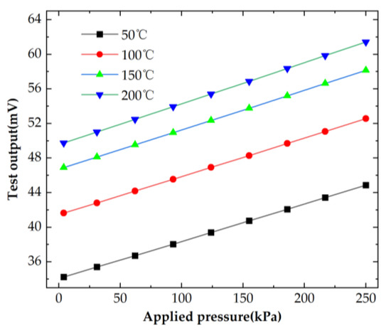 Room temperature, 50 °C, 100 °C, 150 °C and 200 °C were selected as the temperature points for testing. The range of the sensor designed in this paper was 0–250 kPa, so 4 kPa, 31 kPa, 62 kPa, 93 kPa, 124 kPa, 155 kPa, 186 kPa, 217 kPa and 250 kPa were selected as the pressure points for testing. The sensor was tested at 4 kPa; then, the pressure load was increased sequentially and tested at the remaining pressure points. This process is called forward travel. Conversely, it is called reverse travel. A cycle test consists of forward travel and reverse travel. In order to obtain more accurate test results, two cycles were carried out for the sensor at each temperature point. Finally, based on the test data at different temperatures, the performance indicators of the sensors were calculated.