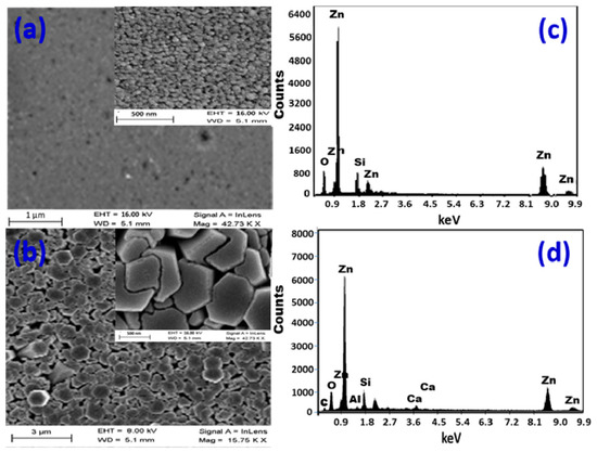The samples were examined using EDX to determine the elemental makeup of the manufactured ZnO nanostructures, as shown in Figure 1c,d. Figure 1c shows the presence of Zn and O signals in the EDX spectrum of a nanoparticulate ZnO film, which correlates to the typical makeup of ZnO. According to the precise EDX study, there is 84.7% Zn and 10% O. Because the EDX interaction volume (≥1 μm) is larger than the film thickness, the Si (5.3%) signal in the EDX chart was identified from the glass substrate.