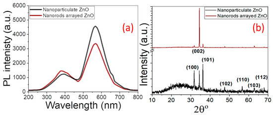 (a) PL spectra and (b) XRD patterns of nanoparticulate and nanorod-arrayed ZnO films.