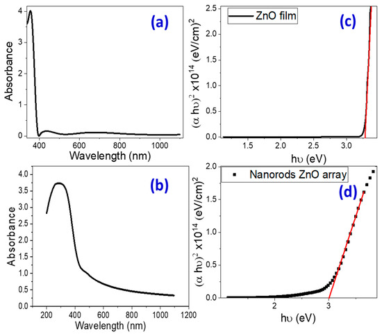 (a,b) Absorbance spectra and (c,d) Tauc’s plots for band gap determination for nanoparticulate and nanorod-arrayed ZnO films. Red line represents the linear fitting of the linear segment of Tauc’s plot (Black curve).