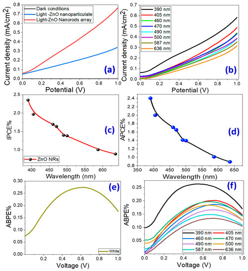 where is the lamp’s illuminating light power density as a function of wavelength (see Supplementary Materials, Table S1). Figure 4c shows how IPCE% varies with wavelength. The highest IPCE% for the nanorod-arrayed ZnO photoelectrode is 2.35% at 390 nm, which correlates to the photoelectrode’s maximum absorption; it then decreases to 1.69% at 460 nm.