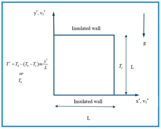 We consider a square enclosure of size L for the analysis, as presented in Figure 1. The vertical border of the left side is linearly warmed, with a temperature pattern of , and the right vertical border is cooled with a temperature of . The other two (horizontal) walls are well-insulated. For this investigation, ternary hybrid nanofluid Al2O3-Ag-CuO/water is considered as the working fluid. In addition, there is no inner thermal production, and the present research disregards the effects of radiation and viscous dissipation. The operating fluid is a Newtonian fluid that is incompressible and has constant characteristics. The Oberbeck–Boussinesq equations have been applied to model the issue for 2D steady and laminar circulation situations. Changes in the density of the nanofluid are taken into account using the Boussinesq approximation. The host liquid (water) and the nano additives are believed to be in heat equilibrium. Below is a representation of the continuity, momentum, and energy equations: [42,43]