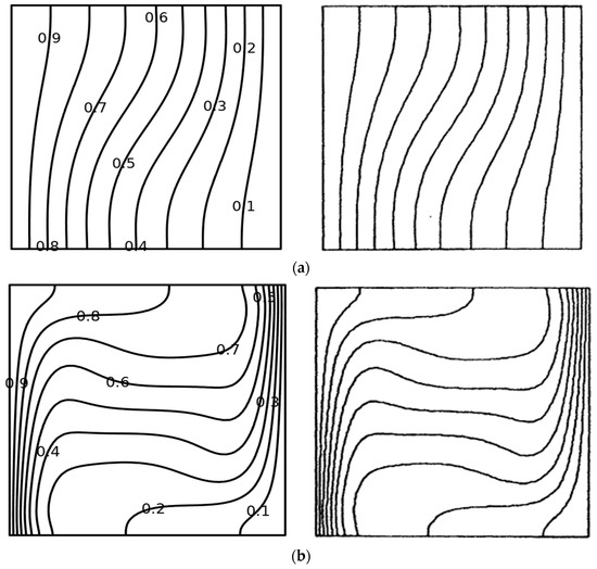 Comparison of isotherms. (a) Isotherms at Ra = 103, (left: Present; Right: De Vahl Davis 1983) [46]. (b) Isotherms at Ra = 105 (left: Present; Right: De Vahl Davis 1983) [46].