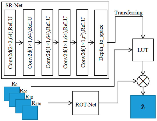 The proposed SR network structure is shown in Figure 1 by combining deep learning and LUT. The new SR network is composed of SR-Net [17] and ROT-Net. SR-Net is a deep learning SR network with a receptive field (RF) size of 4. The SR-Net model is first trained, and then its output is passed to the LUT. ROT-Net is a feature extraction network, which is used to get the weight information at different rotation angles. SR-Net primarily learns the feature information from LR images to HR images, while ROT-Net mainly learns the pixel weight information for weighted fusion of SR results at different angles.