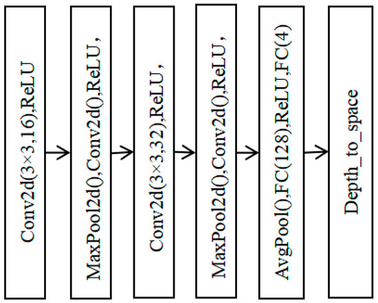 In the paper, considering that the local texture structure used in SR has directionality, the weights at different directions should be different. Therefore, the coefficient value, . for each pixel at different angles is obtained through a lightweight CNN called ROT-Net, whose network structure is shown in Figure 2. ROT-Net consists of three convolutional layers and two fully connected layers, in which the ReLU activation function and max pooling operation are used for feature extraction. To adapt to images with different scales, an adaptive average pooling is introduced to fix the feature size. Finally, the four results from the LUT are fused according to the weights from ROT-Net, and a SR result with more detailed information is obtained.