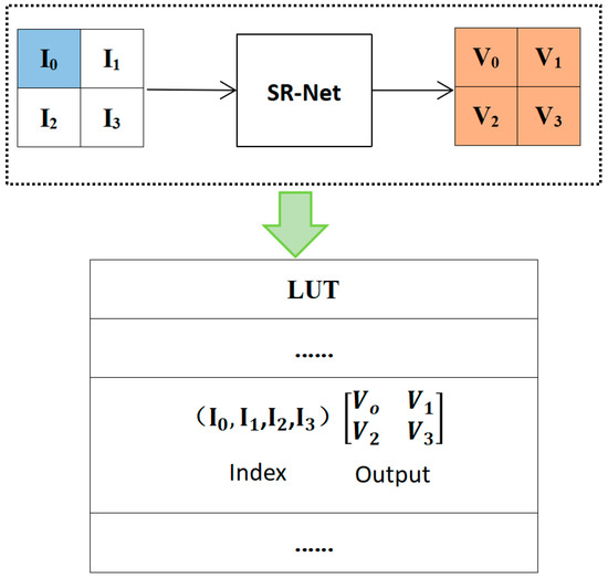 After training the SR-Net network, the LUT is designed for a SR-Net network with an RF size of 4. The mapping method of the LUT is shown in Figure 3. The output values of the network are indexed by four corresponding input values and saved in the LUT. As illustrated in Figure 3, the LUT is the term 4D-LUT, which consists of four input values and two output values.