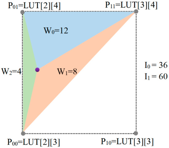 After obtaining the original quantized coordinates, an interpolation calculation is performed using the tetrahedral interpolation method [19]. A tetrahedron is formed by four non-coplanar three-dimensional coordinate points, and interpolation is performed on the four triangles formed by the tetrahedron. Based on the weight of the interpolation point relative to the four vertices of the tetrahedron, the final interpolation result is achieved by weighting the interpolation results of individual triangles. An example of triangular interpolation is a sampled 2D-LUT with the sampling interval of . An example of interpolation for a sampled 2D-LUT with the sampling interval of 4 is shown in Figure 4. For the query input, and , the nearest points, , , and , and the corresponding weights, , , and , are determined. The output value is calculated as the weighted sum. The same principle applies to 3D and 4D LUTs.