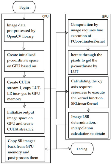where and denote the indexes mapped to the x and y directions of the thread block, respectively. The pre-processed image data and LUT data are inputted into the PCoordinatesKernel GPU kernel function to compute the coordinates, , which are then used for the subsequent calculation of interpolated coordinates. The flow chart for SR of LUTs on the CPU/GPU is shown in Figure 5.