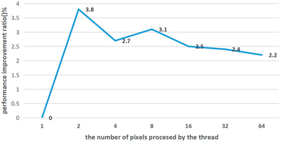 where, and represent the execution time of a certain optimization before and after its effectiveness. From the Figure 6, it can be found that the method achieves a performance improvement ratio of 3.8% when a single GPU thread processes 2 pixels. This experiment proves that a single thread can handle multiple pixels, reducing the grid size. In the experiment, the overall GPU memory consumption is 2622 MiB (a memory usage rate is 10.7%). The results show that the new method can be implemented on lower-memory embedded hardware.