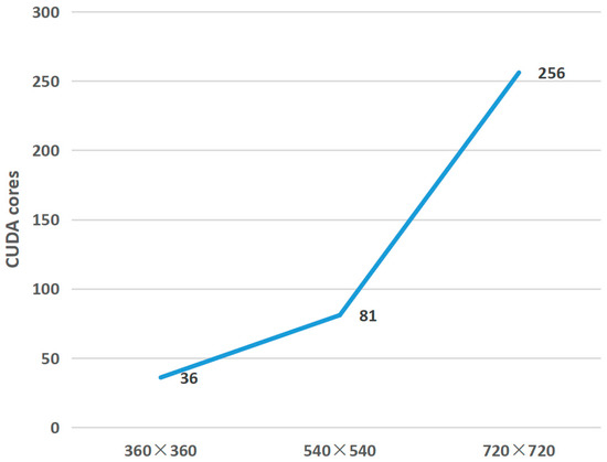 We selected commonly seen low-resolution images in real-world scenarios, with pixel counts of 100,000, 300,000, 500,000, and 1,000,000, which correspond to resolutions ranging from 360 × 360 to 1080 × 1080, to test the performance. As the resolution increases, the number of computing units executed by the kernel also increases. The minimum required number of CUDA cores for the algorithm to run in real-time with different video resolutions is shown in Figure 7. The resolution requires a minimum of 36 cores and achieves 39 FPS; the 540 × 540 resolution requires 81 cores and achieves 25 FPS; and the resolution requires 256 cores and achieves 20 FPS.